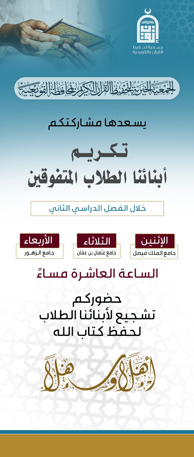 بفضل الله ومنته قسم الشؤون التعليمية بجمعية تحفيظ القرآن الكريم بمحافظة القويعية الفرع النسائي يكرم عشر خاتمات من طالبات الجمعية لختمهن كتاب الله خلال عام 1446 هـ داعيين الله ان يرفع بالقرآن