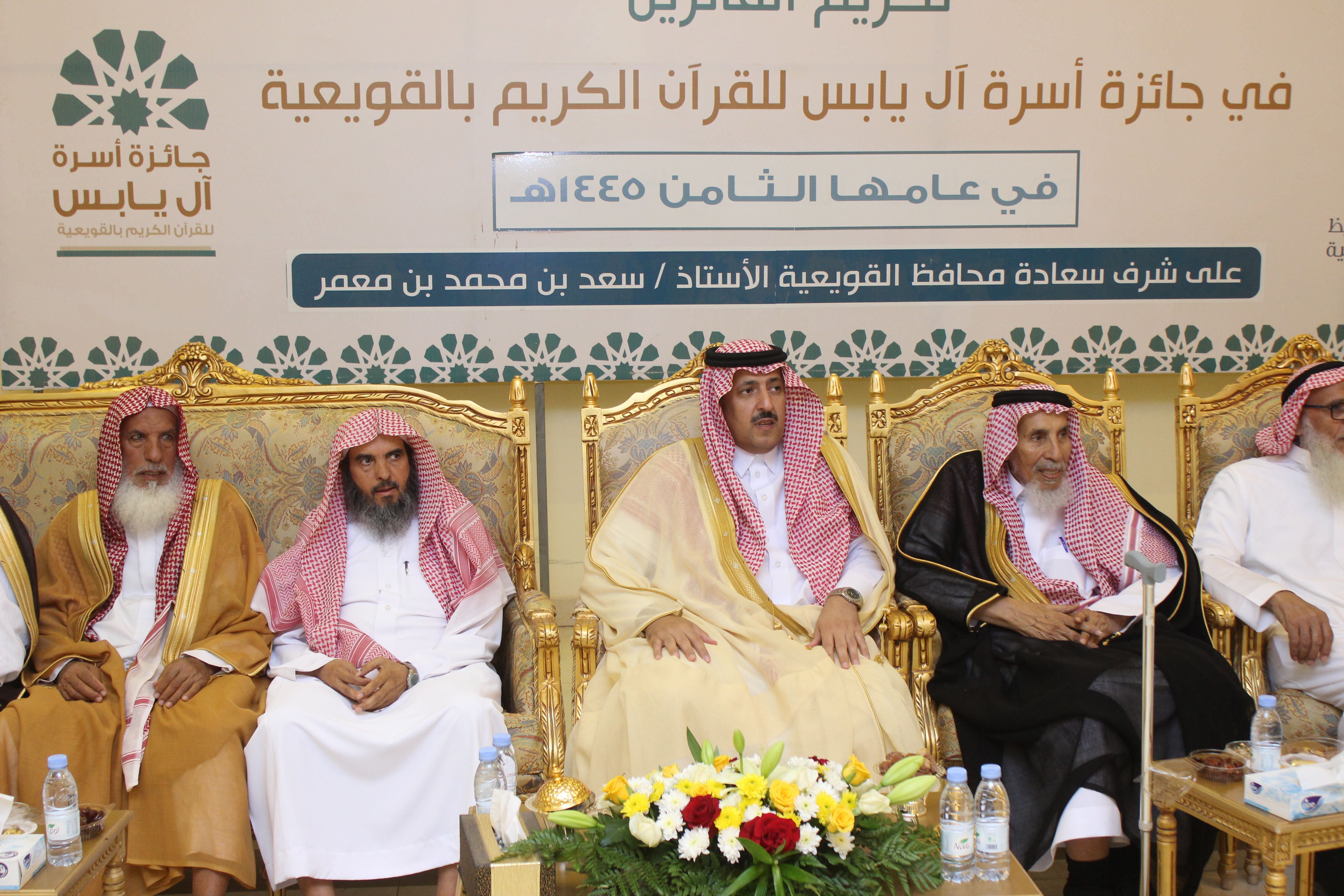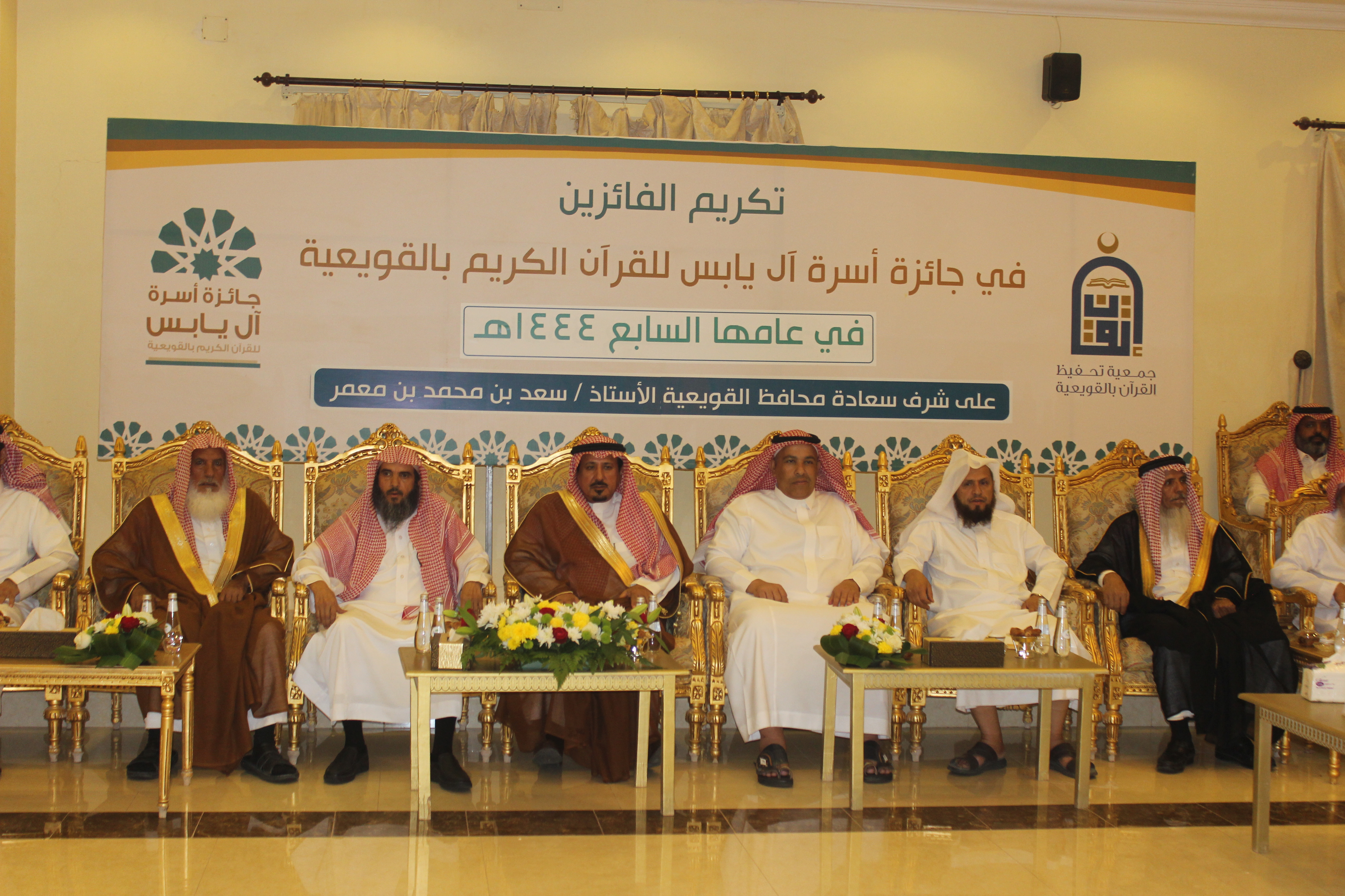 تم بحمد الله على شرف محافظ القويعية الأستاذ/ سعد بن محمد بن معمر تكريم الفائزين بجائزة آل يابس للقرآن الكريم في عامها السابع بقصر آل يابس يوم الأربعاء 11/ 11/ 1444هـ بحضور رئيس الجمعية الخيرية لتح