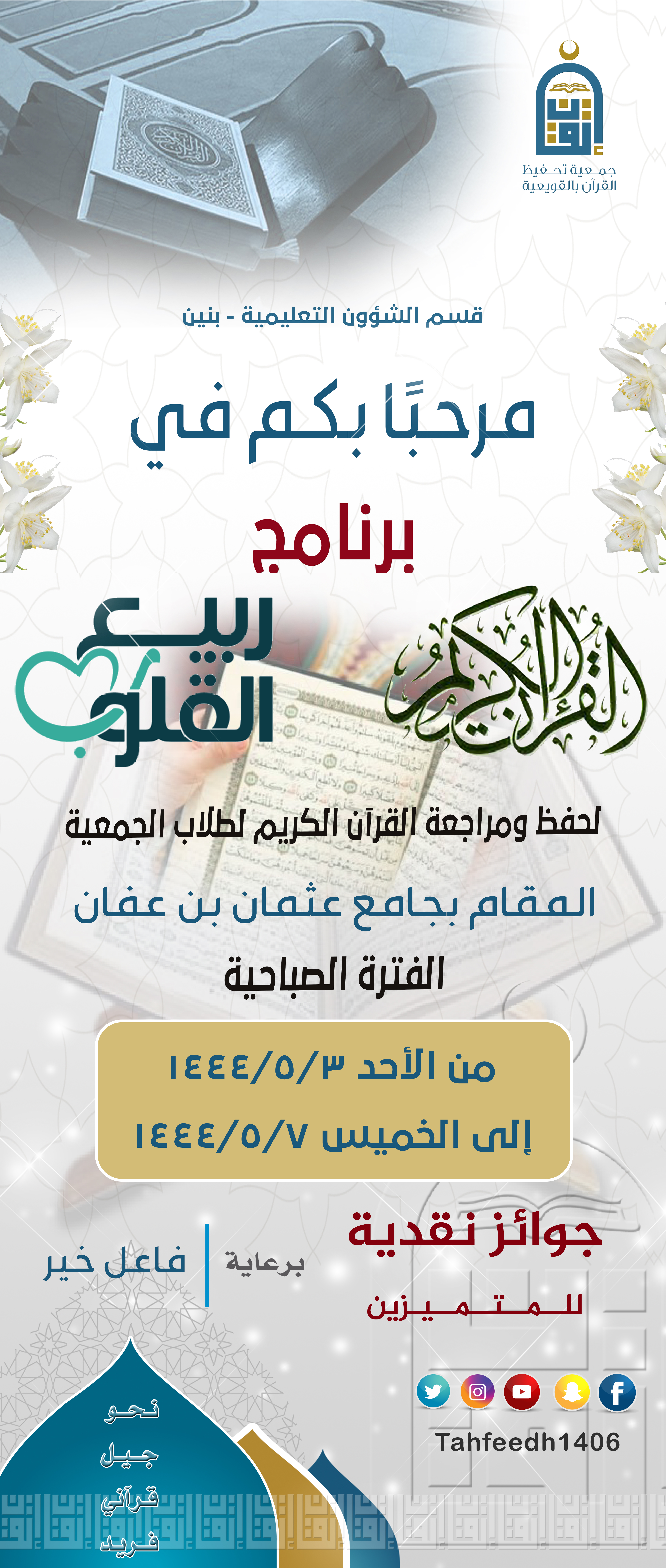 تم بحمد الله وتوفيقه صباح اليوم الأحد 3 جمادى الأولى 1444هـ انطلاقة برنامج (القرآن ربيع القلوب) بجامع عثمان بن عفان بالقويعية بحضور 56 طالبا والذي سيتمر إلى يوم الخميس 7 جمادى الأولى 1444هـ وفي ختام ا