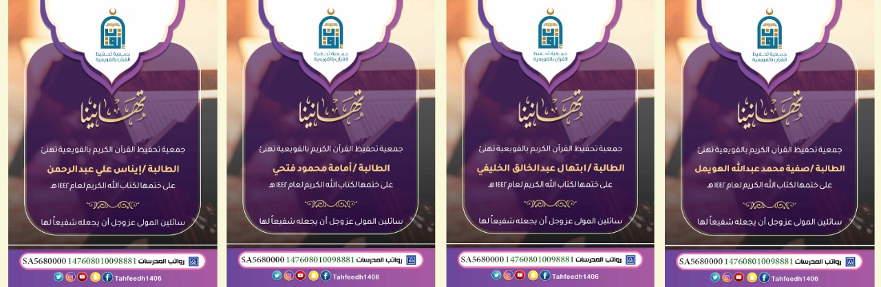 الجمعية الخيرية لتحفيظ القرآن الكريم بمحافظة القويعية ( إتقان ) تهنئ الفائزات في مسابقة أمير الرياض لحفظ القرآن الكريم وتلاوته وتفسيره للبنين والبنات في دورتها السادسة لعام 1442هـ بمنطقة ال