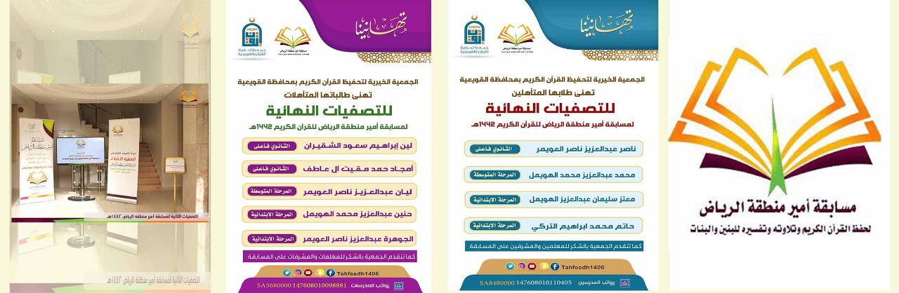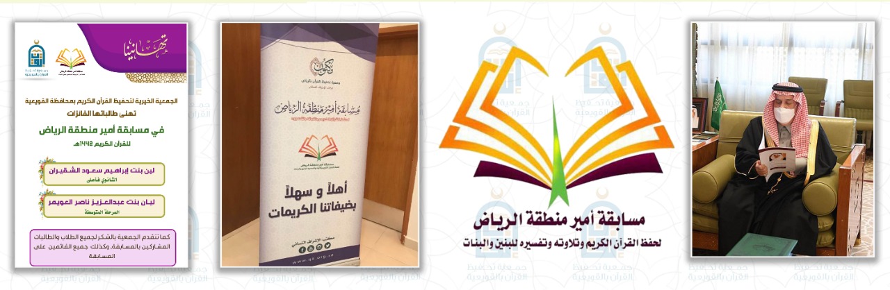 بحمد الله شاركت الجمعية الخيرية لتحفيظ القرآن الكريم بمحافظة القويعية في مسابقة أمير الرياض لحفظ القرآن الكريم وتلاوته وتفسيره للبنين والبنات في دورتها السادسة لعام 1442هـ ضمن ثلاثون جمعية تحفيظ
